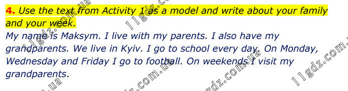 4. Use the text from Activity 1 as a model and write about your family and your week. My name is Maksym. I live with my parents. I also have my grandparents. We live in Kyiv. I go to school every day. On Monday, Wednesday and Friday I go to football. On weekends I visit my grandparents.