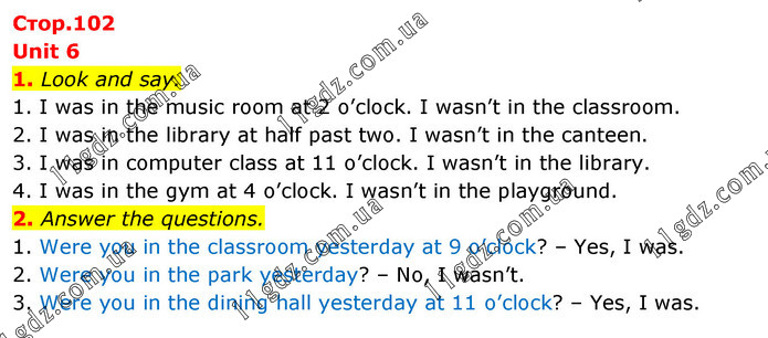 Unit 6 1. Look and say. 1. I was in the music room at 2 o’clock. I wasn’t in the classroom. 2. I was in the library at half past two. I wasn’t in the canteen. 3. I was in computer class at 11 o’clock. I wasn’t in the library. 4. I was in the gym at 4 o’clock. I wasn’t in the playground. 2. Answer the questions. 1. Were you in the classroom yesterday at 9 o’clock? – Yes, I was. 2. Were you in the park yesterday? – No, I wasn’t. 3. Were you in the dining hall yesterday at 11 o’clock? – Yes, I was.