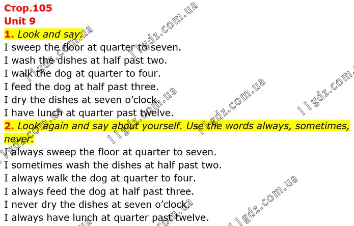 Unit 9 1. Look and say. I sweep the floor at quarter to seven. I wash the dishes at half past two. I walk the dog at quarter to four. I feed the dog at half past three. I dry the dishes at seven o’clock. I have lunch at quarter past twelve. 2. Look again and say about yourself. Use the words always, sometimes, never. I always sweep the floor at quarter to seven. I sometimes wash the dishes at half past two. I always walk the dog at quarter to four. I always feed the dog at half past three. I never dry the dishes at seven o’clock. I always have lunch at quarter past twelve.