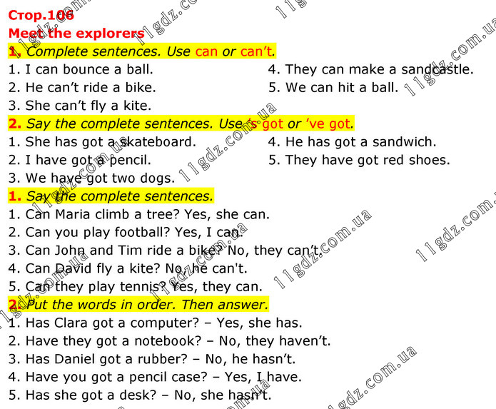 Meet the explorers 1. Complete sentences. Use can or can’t. 1. I can bounce a ball. 2. He can’t ride a bike. 3. She can’t fly a kite. 4. They can make a sandcastle. 5. We can hit a ball. 2. Say the complete sentences. Use ’s got or ’ve got. 1. She has got a skateboard. 2. I have got a pencil. 3. We have got two dogs. 4. He has got a sandwich. 5. They have got red shoes. 1. Say the complete sentences. 1. Can Maria climb a tree? Yes, she can. 2. Can you play football? Yes, I can. 3. Can John and Tim ride a bike? No, they can’t. 4. Can David fly a kite? No, he can't. 5. Can they play tennis? Yes, they can. 2. Put the words in order. Then answer. 1. Has Clara got a computer? – Yes, she has. 2. Have they got a notebook? – No, they haven’t. 3. Has Daniel got a rubber? – No, he hasn’t. 4. Have you got a pencil case? – Yes, I have. 5. Has she got a desk? – No, she hasn’t.