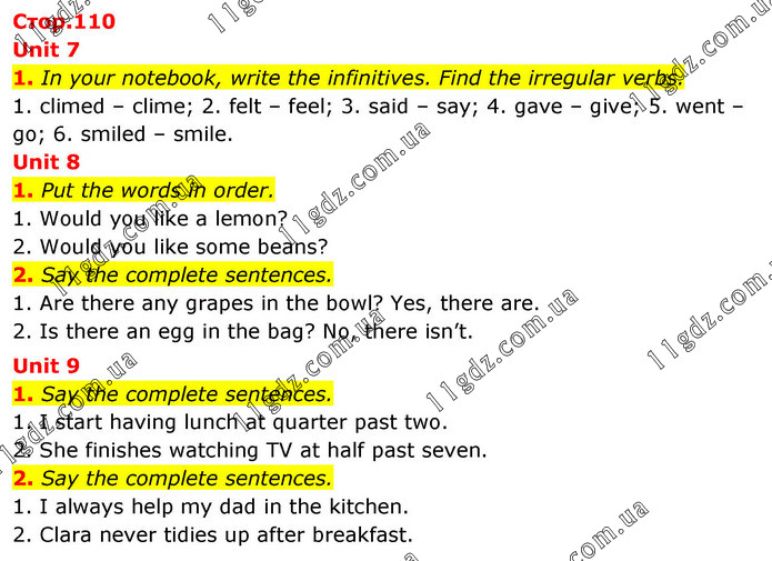 Стор.110 Unit 7 1. In your notebook, write the infinitives. Find the irregular verbs. 1. climed – clime; 2. felt – feel; 3. said – say; 4. gave – give; 5. went – go; 6. smiled – smile. Unit 8 1. Put the words in order. 1. Would you like a lemon? 2. Would you like some beans? 2. Say the complete sentences. 1. Are there any grapes in the bowl? Yes, there are. 2. Is there an egg in the bag? No, there isn’t. Unit 9 1. Say the complete sentences. 1. I start having lunch at quarter past two. 2. She finishes watching TV at half past seven. 2. Say the complete sentences. 1. I always help my dad in the kitchen. 2. Clara never tidies up after breakfast.