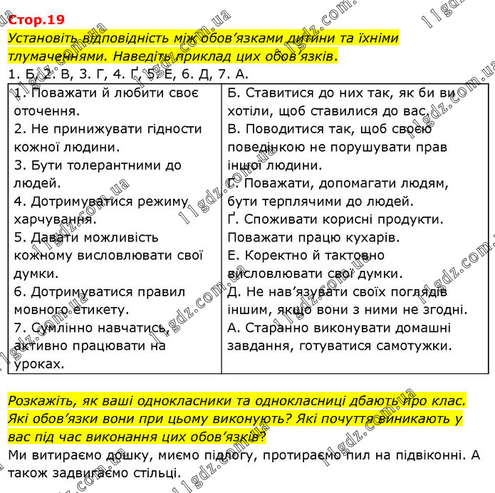 Установіть відповідність між обов’язками дитини та їхніми тлумаченнями. Наведіть приклад цих обов’язків. 1. Б, 2. В, 3. Г, 4. Ґ, 5. Е, 6. Д, 7. А. 1. Поважати й любити своє оточення. 2. Не принижувати гідности кожної людини. 3. Бути толерантними до людей. 4. Дотримуватися режиму харчування. 5. Давати можливість кожному висловлювати свої думки. 6. Дотримуватися правил мовного етикету. 7. Сумлінно навчатись, активно працювати на уроках. Б. Ставитися до них так, як би ви хотіли, щоб ставилися до вас. B. Поводитися так, щоб своєю поведінкою не порушувати прав іншої людини. Г. Поважати, допомагати людям, бути терплячими до людей. Ґ. Споживати корисні продукти. Поважати працю кухарів. Е. Коректно й тактовно висловлювати свої думки. Д. Не нав’язувати своїх поглядів іншим, якщо вони з ними не згодні. A. Старанно виконувати домашні завдання, готуватися самотужки. Розкажіть, як ваші однокласники та однокласниці дбають про клас. Які обов’язки вони при цьому виконують? Які почуття виникають у вас під час виконання цих обов’язків? Ми витираємо дошку, миємо підлогу, протираємо пил на підвіконні. А також задвигаємо стільці.