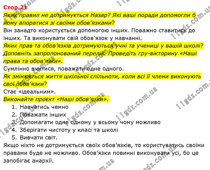 Яких правил не дотримується Назар? Які ваші поради допомогли б йому впоратися зі своїми обов’язками? Він занадто користується допомогою інших. Поважно ставитись до інших. Та виконувати свій обов’язок у навчанні. Яких прав та обов’язків дотримуються учні та учениці у вашій школі? Доповніть запропонований перелік. Проведіть гру-вікторину «Наші права та обов’язки». Сумлінно вчитися, поважати одне одного. Як змінюється життя шкільної спільноти, коли всі її члени виконують свої обов’язки? Стає «ідеальним». Виконайте проєкт «Наші обов’язки». 1. Навчатись чемно 2. Поважати інших 3. Допомагати одне одному у всьому чому можливо 4. Зберігати чистоту у класі та школі 5. Вивчати світ. Якщо ніхто не дотримується своїх обов’язків, то користуватись своїми правами буде не можливо. Обов’язки повинні виконувати усі, бо це запобігає анархії.