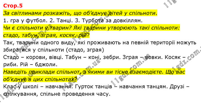 За світлинами розкажіть, що об’єднує дітей у спільноти. 1. гра у футбол. 2. Танці. 3. Турбота за довкіллям. Чи є спільноти у тварин? Які тварини утворюють такі спільноти: стадо, табун, зграя, косяк, рій? Так, тварини одного виду, які проживають на певній території можуть збиратися у спільноти (стадо, зграя) Стадо – корови, вівці. Табун – коні, зебри. Зграя – вовки. Косяк – риби. Рій – бджоли. Наведіть приклади спільнот, з якими ви тісно взаємодієте. Що вас об’єднує в цих спільнотах? Клас у школі – навчання. Гурток танців – навчання танцям. Друзі – спілкування, спільне проведення часу.