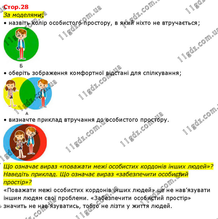 За моделями: • назвіть колір особистого простору, в який ніхто не втручається; • оберіть зображення комфортної відстані для спілкування; • визначте приклад втручання до особистого простору. Що означає вираз «поважати межі особистих кордонів інших людей»? Наведіть приклад. Що означає вираз «забезпечити особистий простір»? «Поважати межі особистих кордонів інших людей» це не нав’язувати іншим людям свої проблеми. «Забезпечити особистий простір» значить не нав’язуватись, тобто не лізти у життя людей.