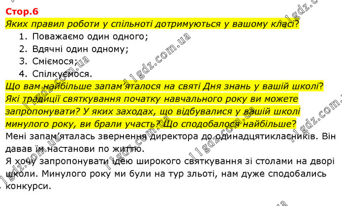 Яких правил роботи у спільноті дотримуються у вашому класі? 1. Поважаємо один одного; 2. Вдячні один одному; 3. Сміємося; 4. Спілкуємося. Що вам найбільше запам’яталося на святі Дня знань у вашій школі? Які традиції святкування початку навчального року ви можете запропонувати? У яких заходах, що відбувалися у вашій школі минулого року, ви брали участь? Що сподобалося найбільше? Мені запам’яталась звернення директора до одинадцятикласників. Він давав їм настанови по життю. Я хочу запропонувати ідею широкого святкування зі столами на дворі школи. Минулого року ми були на тур зльоті, нам дуже сподобались конкурси.