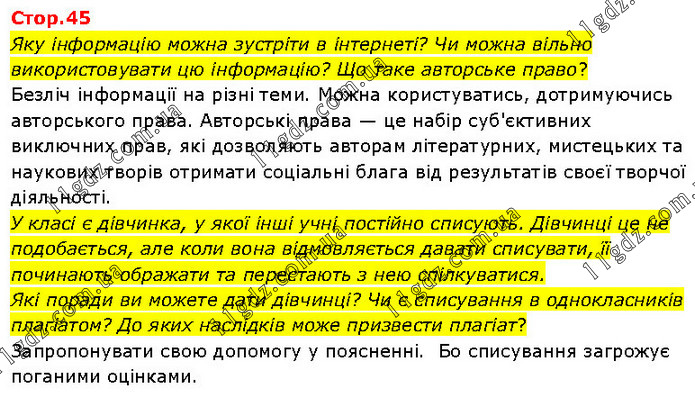 Яку інформацію можна зустріти в інтернеті? Чи можна вільно використовувати цю інформацію? Що таке авторське право? Безліч інформації на різні теми. Можна користуватись, дотримуючись авторського права. Авторські права — це набір суб'єктивних виключних прав, які дозволяють авторам літературних, мистецьких та наукових творів отримати соціальні блага від результатів своєї творчої діяльності. У класі є дівчинка, у якої інші учні постійно списують. Дівчинці це не подобається, але коли вона відмовляється давати списувати, її починають ображати та перестають з нею спілкуватися. Які поради ви можете дати дівчинці? Чи є списування в однокласників плагіатом? До яких наслідків може призвести плагіат? Запропонувати свою допомогу у поясненні. Бо списування загрожує поганими оцінками.