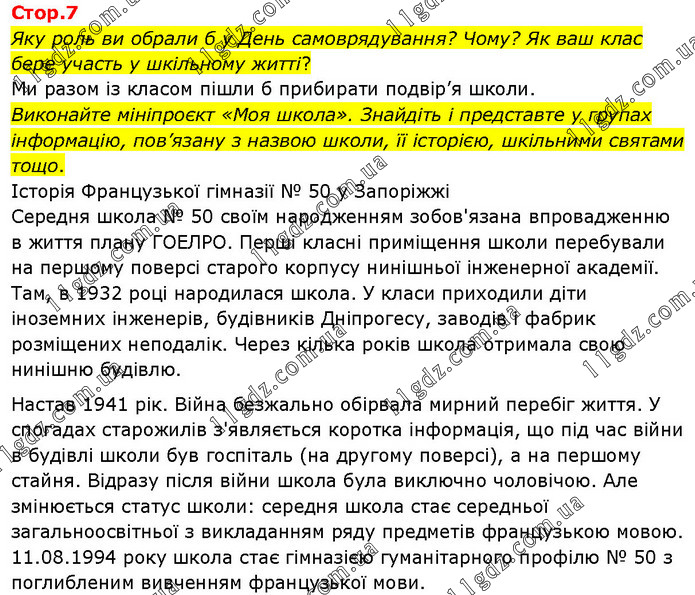 Яку роль ви обрали б у День самоврядування? Чому? Як ваш клас бере участь у шкільному житті? Ми разом із класом пішли б прибирати подвір’я школи. Виконайте мініпроєкт «Моя школа». Знайдіть і представте у групах інформацію, пов’язану з назвою школи, її історією, шкільними святами тощо. Історія Французької гімназії № 50 у Запоріжжі Середня школа № 50 своїм народженням зобов'язана впровадженню в життя плану ГОЕЛРО. Перші класні приміщення школи перебували на першому поверсі старого корпусу нинішньої інженерної академії. Там, в 1932 році народилася школа. У класи приходили діти іноземних інженерів, будівників Дніпрогесу, заводів і фабрик розміщених неподалік. Через кілька років школа отримала свою нинішню будівлю. Настав 1941 рік. Війна безжально обірвала мирний перебіг життя. У спогадах старожилів з'являється коротка інформація, що під час війни в будівлі школи був госпіталь (на другому поверсі), а на першому стайня. Відразу після війни школа була виключно чоловічою. Але змінюється статус школи: середня школа стає середньої загальноосвітньої з викладанням ряду предметів французькою мовою. 11.08.1994 року школа стає гімназією гуманітарного профілю № 50 з поглибленим вивченням французької мови.