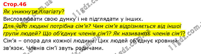 Як уникнути плагіату? Висловлювати свою думку і не підглядати у інших. Для чого людині потрібна сім’я? Чим сім’я відрізняється від іншої групи людей? Що об’єднує членів сім’ї? Як називають членів сім’ї? Сім’я – опора для кожної людини. Цих людей об’єднує кровний зв’язок. Членів сім’ї звуть родичами.