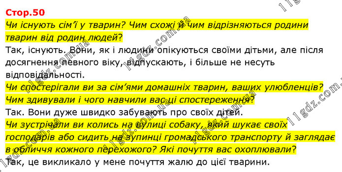 Чи існують сім’ї у тварин? Чим схожі й чим відрізняються родини тварин від родин людей? Так, існують. Вони, як і людини опікуються своїми дітьми, але після досягнення певного віку, відпускають, і більше не несуть відповідальності. Чи спостерігали ви за сім’ями домашніх тварин, ваших улюбленців? Чим здивували і чого навчили вас ці спостереження? Так. Вони дуже швидко забувають про своїх дітей. Чи зустрічали ви колись на вулиці собаку, який шукає своїх господарів або сидить на зупинці громадського транспорту й заглядає в обличчя кожного перехожого? Які почуття вас охоплювали? Так, це викликало у мене почуття жалю до цієї тварини.