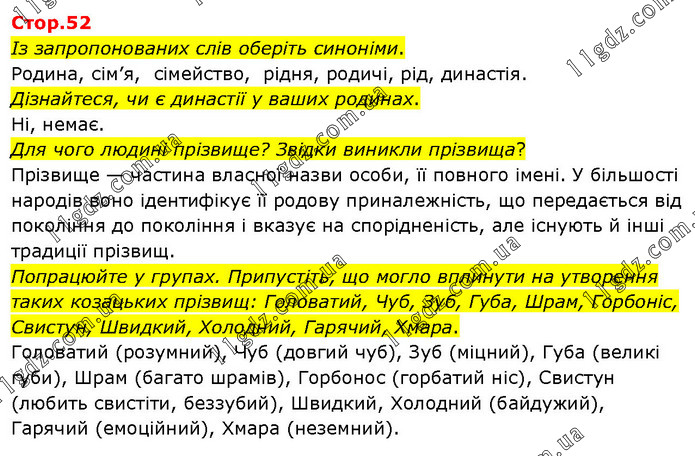 Із запропонованих слів оберіть синоніми. Родина, сім’я, сімейство, рідня, родичі, рід, династія. Дізнайтеся, чи є династії у ваших родинах. Ні, немає. Для чого людині прізвище? Звідки виникли прізвища? Прізвище — частина власної назви особи, її повного імені. У більшості народів воно ідентифікує її родову приналежність, що передається від покоління до покоління і вказує на спорідненість, але існують й інші традиції прізвищ. Попрацюйте у групах. Припустіть, що могло вплинути на утворення таких козацьких прізвищ: Головатий, Чуб, Зуб, Губа, Шрам, Горбоніс, Свистун, Швидкий, Холодний, Гарячий, Хмара. Головатий (розумний), Чуб (довгий чуб), Зуб (міцний), Губа (великі губи), Шрам (багато шрамів), Горбонос (горбатий ніс), Свистун (любить свистіти, беззубий), Швидкий, Холодний (байдужий), Гарячий (емоційний), Хмара (неземний).