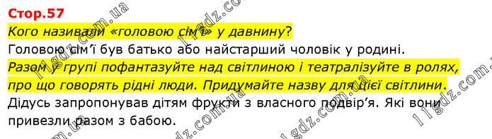 Кого називали «головою сім’ї» у давнину? Головою сім’ї був батько або найстарший чоловік у родині. Разом у групі пофантазуйте над світлиною і театралізуйте в ролях, про що говорять рідні люди. Придумайте назву для цієї світлини. Дідусь запропонував дітям фрукти з власного подвір’я. Які вони привезли разом з бабою.