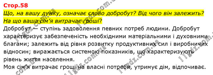 Що, на вашу думку, означає слово добробут? Від чого він залежить? На що ваша сім’я витрачає гроші? Добробут — ступінь задоволення певних потреб людини. Добробут характеризує забезпеченість необхідними матеріальними і духовними благами; залежить від рівня розвитку продуктивних сил і виробничих відносин; виражається системою показників, що характеризують рівень життя населення. Моя сім’я витрачає гроші на власні потреби, утримує дім, відпочиває.