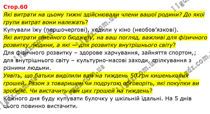 Які витрати на цьому тижні здійснювали члени вашої родини? До якої групи витрат вони належать? Купували їжу (першочергові), ходили у кіно (необов’язкові). Які витрати сімейного бюджету, на ваш погляд, важливі для фізичного розвитку людини, а які — для розвитку внутрішнього світу? Для фізичного розвитку – здорове харчування, зайняття спортом,; для внутрішнього світу – культурно-масові заходи, спілкування з різними людьми. Уявіть, що батьки виділили вам на тиждень 50 грн кишенькових грошей. Разом з товаришем чи подругою обговоріть, які покупки ви зробите. Чи вистачить вам цих грошей на тиждень? Кожного дня буду купувати булочку у шкільній їдальні. На 5 днів цього повинно вистачити.
