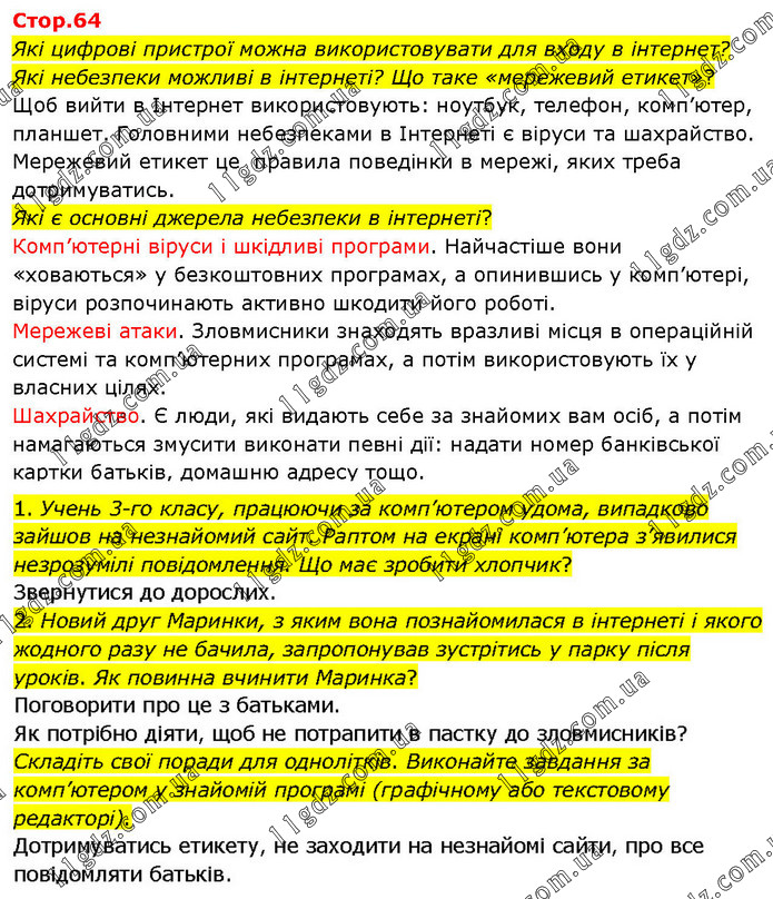 Які цифрові пристрої можна використовувати для входу в інтернет? Які небезпеки можливі в інтернеті? Що таке «мережевий етикет»? Щоб вийти в Інтернет використовують: ноутбук, телефон, комп’ютер, планшет. Головними небезпеками в Інтернеті є віруси та шахрайство. Мережевий етикет це правила поведінки в мережі, яких треба дотримуватись. Які є основні джерела небезпеки в інтернеті? Комп’ютерні віруси і шкідливі програми. Найчастіше вони «ховаються» у безкоштовних програмах, а опинившись у комп’ютері, віруси розпочинають активно шкодити його роботі. Мережеві атаки. Зловмисники знаходять вразливі місця в операційній системі та комп’ютерних програмах, а потім використовують їх у власних цілях. Шахрайство. Є люди, які видають себе за знайомих вам осіб, а потім намагаються змусити виконати певні дії: надати номер банківської картки батьків, домашню адресу тощо. 1. Учень 3-го класу, працюючи за комп’ютером удома, випадково зайшов на незнайомий сайт. Раптом на екрані комп’ютера з’явилися незрозумілі повідомлення. Що має зробити хлопчик? Звернутися до дорослих. 2. Новий друг Маринки, з яким вона познайомилася в інтернеті і якого жодного разу не бачила, запропонував зустрітись у парку після уроків. Як повинна вчинити Маринка? Поговорити про це з батьками. Як потрібно діяти, щоб не потрапити в пастку до зловмисників? Складіть свої поради для однолітків. Виконайте завдання за комп’ютером у знайомій програмі (графічному або текстовому редакторі). Дотримуватись етикету, не заходити на незнайомі сайти, про все повідомляти батьків.