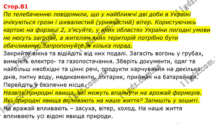 По телебаченню повідомили, що у найближчі дві доби в Україні очікуються грози і шквалистий (уривчастий) вітер. Користуючись картою на форзаці 2, з’ясуйте, у яких областях України погодні умови не несуть загрози, а жителям яких територій потрібно бути обачливими. Запропонуйте їм кілька порад. Закрийте вікна та відійдіть від них подалі. Загасіть вогонь у грубах, вимкніть електро- та газопостачання. Зберіть документи, одяг та найбільш необхідні та цінні речі, продукти харчування на декілька днів, питну воду, медикаменти, ліхтарик, приймач на батарейках. Перейдіть у безпечне місце. Назвіть природні явища, які можуть вплинути на врожай фермерів. Які природні явища впливають на наше життя? Запишіть у зошиті. На вражай впливають – засуха, вітер, холод. На наше життя впливають усі відомі явища природи.