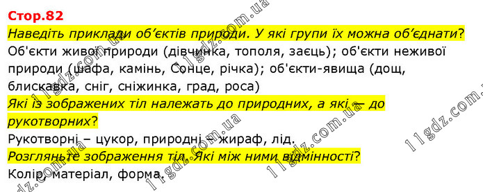 Наведіть приклади об’єктів природи. У які групи їх можна об’єднати? Об'єкти живої природи (дівчинка, тополя, заєць); об'єкти неживої природи (шафа, камінь, Сонце, річка); об'єкти-явища (дощ, блискавка, сніг, сніжинка, град, роса) Які із зображених тіл належать до природних, а які — до рукотворних? Рукотворні – цукор, природні – жираф, лід. Розгляньте зображення тіл. Які між ними відмінності? Колір, матеріал, форма.