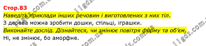 Наведіть приклади інших речовин і виготовлених з них тіл. З дерева можна зробити дошки, стільці, іграшки. Виконайте дослід. Дізнайтеся, чи змінює повітря форму та об’єм. Ні, не змінює, бо аморфне.