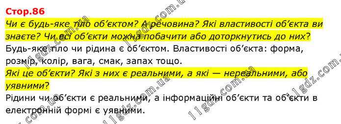 Чи є будь-яке тіло об’єктом? А речовина? Які властивості об’єкта ви знаєте? Чи всі об’єкти можна побачити або доторкнутись до них? Будь-яке тіло чи рідина є об’єктом. Властивості об’єкта: форма, розмір, колір, вага, смак, запах тощо. Які це об’єкти? Які з них є реальними, а які — нереальними, або уявними? Рідини чи об’єкти є реальними, а інформаційні об’єкти та об’єкти в електронній формі є уявними.