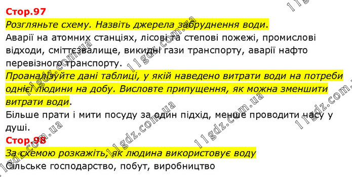 Розгляньте схему. Назвіть джерела забруднення води. Аварії на атомних станціях, лісові та степові пожежі, промислові відходи, сміттєзвалище, викидні гази транспорту, аварії нафто перевізного транспорту. Проаналізуйте дані таблиці, у якій наведено витрати води на потреби однієї людини на добу. Висловте припущення, як можна зменшити витрати води. Більше прати і мити посуду за один підхід, менше проводити часу у душі. Стор.98 За схемою розкажіть, як людина використовує воду Сільське господарство, побут, виробництво