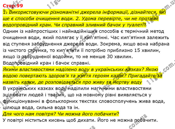 1. Використовуючи різноманітні джерела інформації, дізнайтеся, які ще є способи очищення води. 2. Удома перевірте, чи не протікає водопровідний кран. Чи справний зливний бачок у туалеті? Одним із найпростіших і найнадійніших способів є термічний метод очищення води, який полягає у її кип'ятінні. Час кип'ятіння залежить від ступеня забруднення джерела води. Зокрема, якщо вона набрана із чистого струмка, то кип'ятити її потрібно приблизно 15 хвилин, якщо із забрудненої водойми, то не менше 30 хвилин. Водопровідний кран і бачок справні. Якими властивостями наділено воду в українських казках? Якою водою повертають здоров’я та життя героям казок? Пригадайте та назвіть казки, де розповідається про живу та мертву воду В українських казках воду наділили магічними властивостями зцілювати людей і тварин, що на мовному рівні виявляється у функціонуванні в фольклорних текстах словосполучень жива вода, цілюща вода, сильна вода та ін. Для чого нам повітря? Чи можна його побачити? У повітрі міститься кисень щоб дихати. Його не можна побачити.
