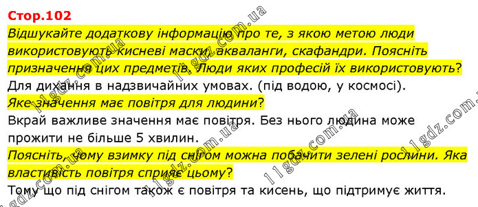 Відшукайте додаткову інформацію про те, з якою метою люди використовують кисневі маски, акваланги, скафандри. Поясніть призначення цих предметів. Люди яких професій їх використовують? Для дихання в надзвичайних умовах. (під водою, у космосі). Яке значення має повітря для людини? Вкрай важливе значення має повітря. Без нього людина може прожити не більше 5 хвилин. Поясніть, чому взимку під снігом можна побачити зелені рослини. Яка властивість повітря сприяє цьому? Тому що під снігом також є повітря та кисень, що підтримує життя.
