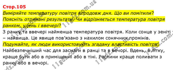 Виміряйте температуру повітря впродовж дня. Що ви помітили? Поясніть отримані результати. Чи відрізняється температура повітря ранком, удень і ввечері? З ранку та ввечері найменша температура повітря. Коли сонце у зеніті – найвища. Це явище пов’язано з нахилом сонячних промінів. Подумайте, як люди використовують згадану властивість повітря. Найбезпечніший час для засмаги в ранці та в вечорі. Вдень, в літку, краще бути або в приміщенні або в тіні. Рослини краще поливати з ранку або в вечорі.
