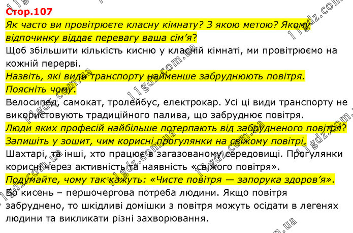 Як часто ви провітрюєте класну кімнату? З якою метою? Якому відпочинку віддає перевагу ваша сім’я? Щоб збільшити кількість кисню у класній кімнаті, ми провітрюємо на кожній перерві. Назвіть, які види транспорту найменше забруднюють повітря. Поясніть чому. Велосипед, самокат, тролейбус, електрокар. Усі ці види транспорту не використовують традиційного палива, що забруднює повітря. Люди яких професій найбільше потерпають від забрудненого повітря? Запишіть у зошит, чим корисні прогулянки на свіжому повітрі. Шахтарі, та інші, хто працює в загазованому середовищі. Прогулянки корисні через активність та наявність «свіжого повітря». Подумайте, чому так кажуть: «Чисте повітря — запорука здоров’я». Бо кисень – першочергова потреба людини. Якщо повітря забруднено, то шкідливі домішки з повітря можуть осідати в легенях людини та викликати різні захворювання.