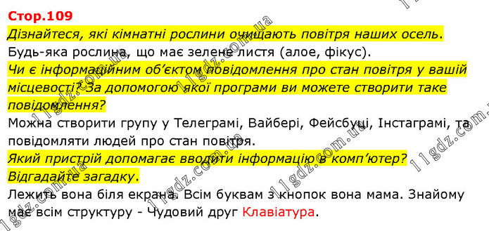 Дізнайтеся, які кімнатні рослини очищають повітря наших осель. Будь-яка рослина, що має зелене листя (алое, фікус). Чи є інформаційним об’єктом повідомлення про стан повітря у вашій місцевості? За допомогою якої програми ви можете створити таке повідомлення? Можна створити групу у Телеграмі, Вайбері, Фейсбуці, Інстаграмі, та повідомляти людей про стан повітря. Який пристрій допомагає вводити інформацію в комп’ютер? Відгадайте загадку. Лежить вона біля екрана. Всім буквам з кнопок вона мама. Знайому має всім структуру - Чудовий друг Клавіатура.