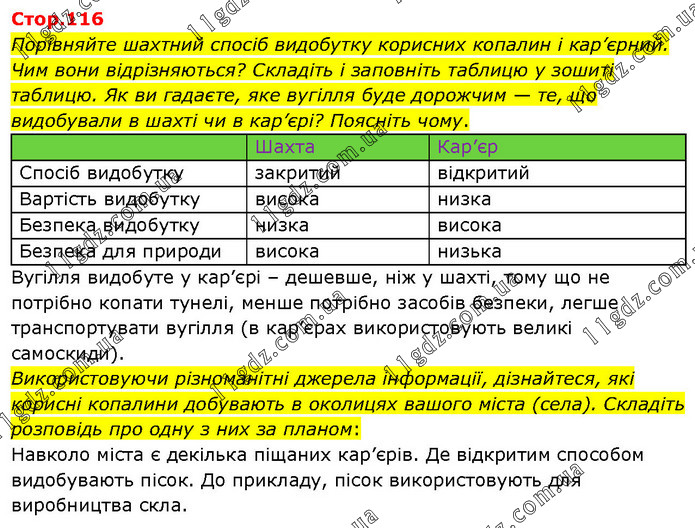 Порівняйте шахтний спосіб видобутку корисних копалин і кар’єрний. Чим вони відрізняються? Складіть і заповніть таблицю у зошиті таблицю. Як ви гадаєте, яке вугілля буде дорожчим — те, що видобували в шахті чи в кар’єрі? Поясніть чому. Шахта Кар’єр Спосіб видобутку закритий відкритий Вартість видобутку висока низка Безпека видобутку низка висока Безпека для природи висока низька Вугілля видобуте у кар’єрі – дешевше, ніж у шахті, тому що не потрібно копати тунелі, менше потрібно засобів безпеки, легше транспортувати вугілля (в кар’єрах використовують великі самоскиди). Використовуючи різноманітні джерела інформації, дізнайтеся, які корисні копалини добувають в околицях вашого міста (села). Складіть розповідь про одну з них за планом: Навколо міста є декілька піщаних кар’єрів. Де відкритим способом видобувають пісок. До прикладу, пісок використовують для виробництва скла.