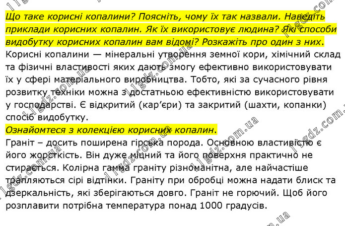 Що таке корисні копалини? Поясніть, чому їх так назвали. Наведіть приклади корисних копалин. Як їх використовує людина? Які способи видобутку корисних копалин вам відомі? Розкажіть про один з них. Корисні копалини — мінеральні утворення земної кори, хімічний склад та фізичні властивості яких дають змогу ефективно використовувати їх у сфері матеріального виробництва. Тобто, які за сучасного рівня розвитку техніки можна з достатньою ефективністю використовувати у господарстві. Є відкритий (кар’єри) та закритий (шахти, копанки) спосіб видобутку. Ознайомтеся з колекцією корисних копалин. Граніт – досить поширена гірська порода. Основною властивістю є його жорсткість. Він дуже міцний та його поверхня практично не стирається. Колірна гамма граніту різноманітна, але найчастіше трапляються сірі відтінки. Граніту при обробці можна надати блиск та дзеркальність, які зберігаються довго. Граніт не горючий. Щоб його розплавити потрібна температура понад 1000 градусів.