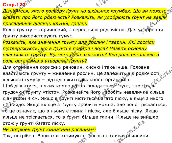 Дізнайтеся, якого кольору ґрунт на шкільних клумбах. Що ви можете сказати про його родючість? Розкажіть, як удобрюють ґрунт на вашій присадибній ділянці, клумбі, грядці. Колір ґрунту – коричневий, з середньою родючістю. Для удобрення ґрунту використовують гумус. Розкажіть, яке значення ґрунту для рослин і тварин. Які досліди підтверджують, що в ґрунті є повітря і вода? Назвіть основну властивість ґрунту. Від чого вона залежить? Яка роль організмів в роль організмів в утворенні ґрунту? Для отримання корисних речовин, кисню і таке інше. Головна властивість ґрунту – живлення рослин. Це залежить від родючості, і кількості гумусу – відходів життєдіяльності організмів. Щоб дізнатися, з яких компонентів складається ґрунт, замісіть з грудочки ґрунту «тісто». Розкачайте його і зробіть невеличке кільце діаметром 4 см. Якщо в ґрунті міститься багато піску, кільця з нього не вийде. Якщо кільце з ґрунту зробити можна, але воно тріскається, то це означає, що в ньому є глина і пісок, але більше піску. Якщо кільце не тріскається, то в ґрунті більше глини. Кільце не вийшло, отож у ґрунті багато піску. Чи потрібен ґрунт кімнатним рослинам? Так, потрібен. Вони теж отримують з нього поживні речовини.