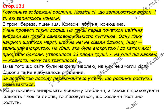Розгляньте зображені рослини. Назвіть ті, що запилюються вітром, і ті, які запилюють комахи. Вітром: береза, пшениця. Комахи: яблуня, конюшина. Учені провели такий дослід. На груші перед початком цвітіння вибрали дві гілки з однаковою кількістю пуп’янків. Одну гілку накрили шматком марлі, щоб на неї не сідали бджоли, іншу — залишили відкритою. На гілці, яка була відкритою і до квіток якої прилітали бджоли, утворилося 33 плоди груші. А на гілці під марлею — жодного. Чому так трапилося? Із-за того що квіти були накрити марлею, на них не змогли сісти бджоли та не відбувалось опилення. За допомогою досліду переконайтеся у тому, що рослини ростуть і розвиваються. Якщо постійно вимірювати довжину стеблини, а також підраховувати кількість гілок та листів, то з’ясовується, що рослини постійно ростуть.