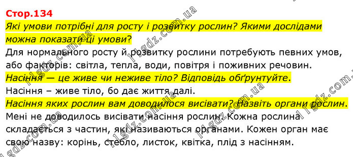 Які умови потрібні для росту і розвитку рослин? Якими дослідами можна показати ці умови? Для нормального росту й розвитку рослини потребують певних умов, або факторів: світла, тепла, води, повітря і поживних речовин. Насіння — це живе чи неживе тіло? Відповідь обґрунтуйте. Насіння – живе тіло, бо дає життя далі. Насіння яких рослин вам доводилося висівати? Назвіть органи рослин. Мені не доводилось висівати насіння рослин. Кожна рослина складається з частин, які називаються органами. Кожен орган має свою назву: корінь, стебло, листок, квітка, плід з насінням.