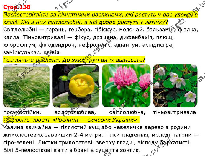 Поспостерігайте за кімнатними рослинами, які ростуть у вас удома, в класі. Які з них світлолюбні, а які добре ростуть у затінку? Світлолюбні — герань, гербера, гібіскус, молочай, бальзамін, фіалка, калла. Тіньовитривалі — фікус, драцена, дифенбахія, плющ, хлорофітум, філодендрон, нефролепіс, адіантум, аспідистра, заміокулькас, клівія. Розгляньте рослини. До яких груп ви їх віднесете? посухостійки, вологолюбива, світлолюбна, тіньовитривала Розробіть проєкт «Рослини — символи України». Калина звичайна — гіллястий кущ або невеличке дерево з родини жимолостевих заввишки 2-4 метри. Гілки гладенькі, молоді пагони — сіро-зелені. Листки трилопатеві, зверху гладкі, зісподу бархатисті. Білі 5-пелюсткові квіти зібрані в суцвіття зонтик.