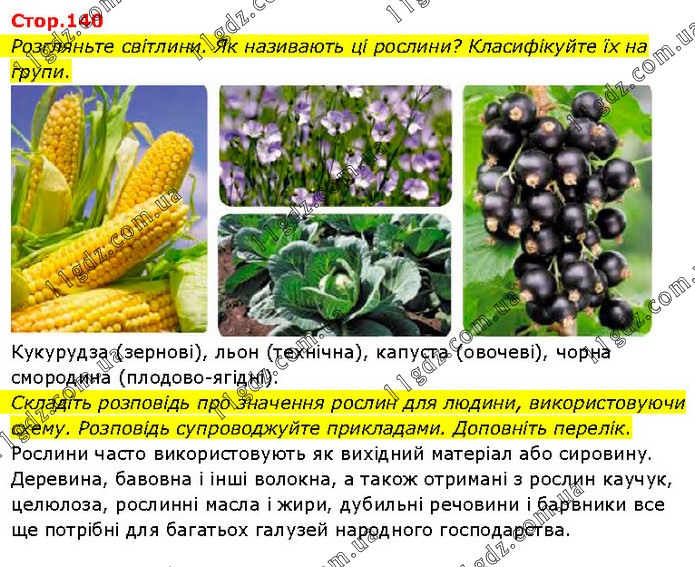 Розгляньте світлини. Як називають ці рослини? Класифікуйте їх на групи. • • Кукурудза (зернові), льон (технічна), капуста (овочеві), чорна смородина (плодово-ягідні). • Складіть розповідь про значення рослин для людини, використовуючи схему. Розповідь супроводжуйте прикладами. Доповніть перелік. • Рослини часто використовують як вихідний матеріал або сировину. Деревина, бавовна і інші волокна, а також отримані з рослин каучук, целюлоза, рослинні масла і жири, дубильні речовини і барвники все ще потрібні для багатьох галузей народного господарства.
