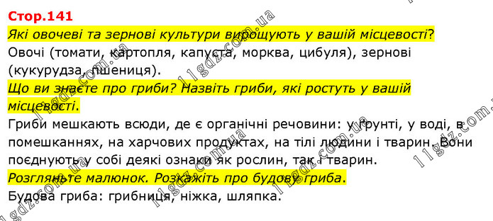 Які овочеві та зернові культури вирощують у вашій місцевості? Овочі (томати, картопля, капуста, морква, цибуля), зернові (кукурудза, пшениця). Що ви знаєте про гриби? Назвіть гриби, які ростуть у вашій місцевості. Гриби мешкають всюди, де є органічні речовини: у ґрунті, у воді, в помешканнях, на харчових продуктах, на тілі людини і тварин. Вони поєднують у собі деякі ознаки як рослин, так і тварин. Розгляньте малюнок. Розкажіть про будову гриба. Будова гриба: грибниця, ніжка, шляпка.