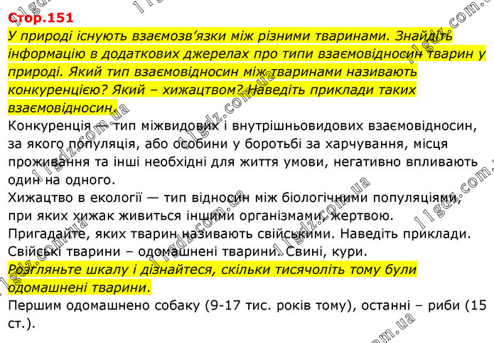 У природі існують взаємозв’язки між різними тваринами. Знайдіть інформацію в додаткових джерелах про типи взаємовідносин тварин у природі. Який тип взаємовідносин між тваринами називають конкуренцією? Який – хижацтвом? Наведіть приклади таких взаємовідносин. Конкуренція — тип міжвидових і внутрішньовидових взаємовідносин, за якого популяція, або особини у боротьбі за харчування, місця проживання та інші необхідні для життя умови, негативно впливають один на одного. Хижацтво в екології — тип відносин між біологічними популяціями, при яких хижак живиться іншими організмами, жертвою. Пригадайте, яких тварин називають свійськими. Наведіть приклади. Свійські тварини – одомашнені тварини. Свині, кури. Розгляньте шкалу і дізнайтеся, скільки тисячоліть тому були одомашнені тварини. Першим одомашнено собаку (9-17 тис. років тому), останні – риби (15 ст.).