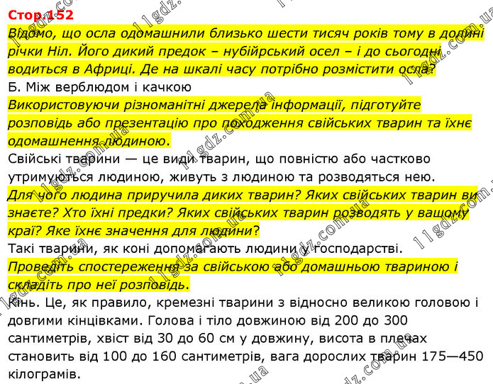 Відомо, що осла одомашнили близько шести тисяч років тому в долині річки Ніл. Його дикий предок – нубійрський осел – і до сьогодні водиться в Африці. Де на шкалі часу потрібно розмістити осла? Б. Між верблюдом і качкою Використовуючи різноманітні джерела інформації, підготуйте розповідь або презентацію про походження свійських тварин та їхнє одомашнення людиною. Свійські тварини — це види тварин, що повністю або частково утримуються людиною, живуть з людиною та розводяться нею. Для чого людина приручила диких тварин? Яких свійських тварин ви знаєте? Хто їхні предки? Яких свійських тварин розводять у вашому краї? Яке їхнє значення для людини? Такі тварини, як коні допомагають людини у господарстві. Проведіть спостереження за свійською або домашньою твариною і складіть про неї розповідь. Кінь. Це, як правило, кремезні тварини з відносно великою головою і довгими кінцівками. Голова і тіло довжиною від 200 до 300 сантиметрів, хвіст від 30 до 60 см у довжину, висота в плечах становить від 100 до 160 сантиметрів, вага дорослих тварин 175—450 кілограмів.