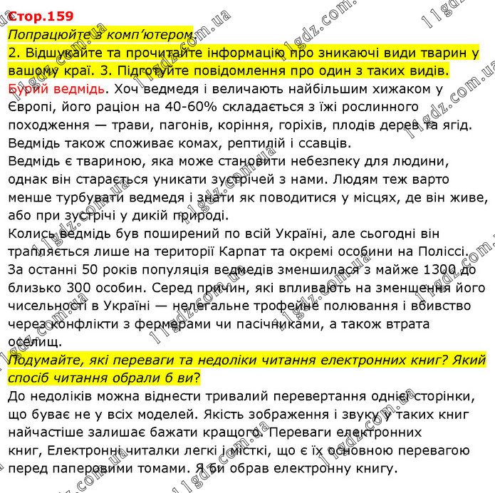 Попрацюйте з комп’ютером. 2. Відшукайте та прочитайте інформацію про зникаючі види тварин у вашому краї. 3. Підготуйте повідомлення про один з таких видів. Бурий ведмідь. Хоч ведмедя і величають найбільшим хижаком у Європі, його раціон на 40-60% складається з їжі рослинного походження — трави, пагонів, коріння, горіхів, плодів дерев та ягід. Ведмідь також споживає комах, рептилій і ссавців. Ведмідь є твариною, яка може становити небезпеку для людини, однак він старається уникати зустрічей з нами. Людям теж варто менше турбувати ведмедя і знати як поводитися у місцях, де він живе, або при зустрічі у дикій природі. Колись ведмідь був поширений по всій Україні, але сьогодні він трапляється лише на території Карпат та окремі особини на Поліссі. За останні 50 років популяція ведмедів зменшилася з майже 1300 до близько 300 особин. Серед причин, які впливають на зменшення його чисельності в Україні — нелегальне трофейне полювання і вбивство через конфлікти з фермерами чи пасічниками, а також втрата оселищ. Подумайте, які переваги та недоліки читання електронних книг? Який спосіб читання обрали б ви? До недоліків можна віднести тривалий перевертання однієї сторінки, що буває не у всіх моделей. Якість зображення і звуку у таких книг найчастіше залишає бажати кращого. Переваги електронних книг, Електронні читалки легкі і місткі, що є їх основною перевагою перед паперовими томами. Я би обрав електронну книгу.