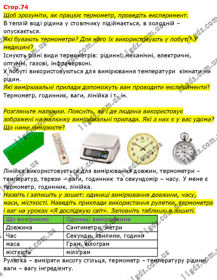 Щоб зрозуміти, як працює термометр, проведіть експеримент. В теплій воді рідина у стовпчику підіймається, в холодній – опускається. Які бувають термометри? Для чого їх використовують у побуті? У медицині? Існують різні види термометрів: рідинні, механічні, електричні, оптичні, газові, інфрачервоні. У побуті використовуються для вимірювання температури кімнати чи рідин. Які вимірювальні прилади допоможуть вам проводити експерименти? Термометр, годинник, ваги, лінійка і т. ін. Розгляньте малюнки. Поясніть, як і де людина використовує зображені на малюнку вимірювальні прилади. Які з них є у вас удома? Що ними вимірюєте? Лінійка використовується для вимірювання довжин, термометри – температур, терези – ваги, годинник та секундомір – часу. У мене є термометр, годинник, лінійка. Назвіть і запишіть у зошит: одиниці вимірювання довжини, часу, маси, місткості. Наведіть приклади використання рулетки, термометра і ваг на уроках «Я досліджую світ». Заповніть таблицю в зошиті. Що вимірюємо Одиниці вимірювання Довжина Сантиметри, метри Час Секунди, хвилини, години маса Грам, кілограм місткість міліграм Рулетка – виміряти висоту стільця, термометр – температуру рідини, ваги – вагу інгредієнту.