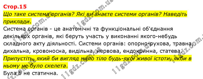 Що таке система органів? Які ви знаєте системи органів? Наведіть приклади. Система органів - це анатомічні та функціональні об'єднання декількох органів, які беруть участь у виконанні якого-небудь складного акту діяльності. Системи органів: опорно-рухова, травна, дихальна, кровоносна, видільна, нервова, ендокринна, статева. Припустіть, який би вигляд мало тіло будь-якої живої істоти, якби в ньому не було скелета. 2. Була б не статична.