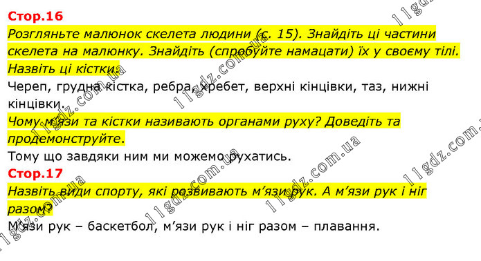Стор.16 Розгляньте малюнок скелета людини (с. 15). Знайдіть ці частини скелета на малюнку. Знайдіть (спробуйте намацати) їх у своєму тілі. Назвіть ці кістки. Череп, грудна кістка, ребра, хребет, верхні кінцівки, таз, нижні кінцівки. Чому м’язи та кістки називають органами руху? Доведіть та продемонструйте. 4. Тому що завдяки ним ми можемо рухатись. Стор.17 Назвіть види спорту, які розвивають м’язи рук. А м’язи рук і ніг разом? М’язи рук – баскетбол, м’язи рук і ніг разом – плавання.