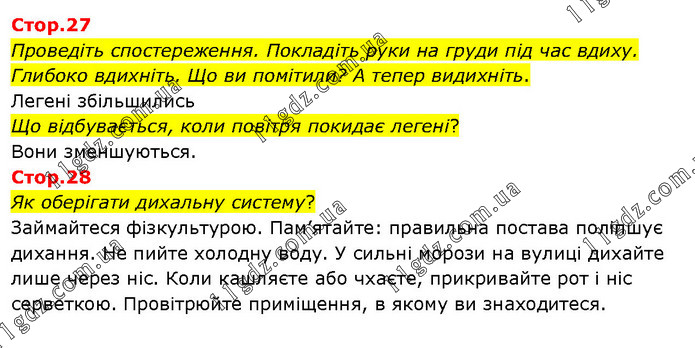 Стор.27 Проведіть спостереження. Покладіть руки на груди під час вдиху. Глибоко вдихніть. Що ви помітили? А тепер видихніть. Легені збільшились Що відбувається, коли повітря покидає легені? Вони зменшуються. Стор.28 Як оберігати дихальну систему? Займайтеся фізкультурою. Пам’ятайте: правильна постава поліпшує дихання. Не пийте холодну воду. У сильні морози на вулиці дихайте лише через ніс. Коли кашляєте або чхаєте, прикривайте рот і ніс серветкою. Провітрюйте приміщення, в якому ви знаходитеся.