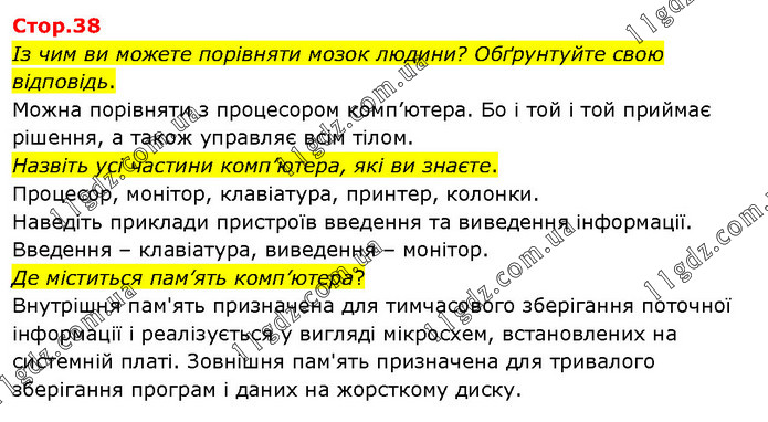 Із чим ви можете порівняти мозок людини? Обґрунтуйте свою відповідь. Можна порівняти з процесором комп’ютера. Бо і той і той приймає рішення, а також управляє всім тілом. Назвіть усі частини комп’ютера, які ви знаєте. Процесор, монітор, клавіатура, принтер, колонки. Наведіть приклади пристроїв введення та виведення інформації. Введення – клавіатура, виведення – монітор. Де міститься пам’ять комп’ютера? Внутрішня пам'ять призначена для тимчасового зберігання поточної інформації і реалізується у вигляді мікросхем, встановлених на системній платі. Зовнішня пам'ять призначена для тривалого зберігання програм і даних на жорсткому диску.