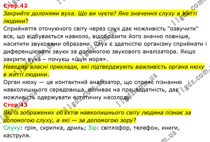 Стор.42 Закрийте долонями вуха. Що ви чуєте? Яке значення слуху в житті людини? Сприйняття оточуючого світу через слух дає можливість "озвучити" все, що відбувається навколо, відобразити його значно повніше, наситити звуковими образами. Слух є здатністю організму сприймати і диференціювати звуки за допомогою звукового аналізатора. Якщо закрити вуха – почуєш «шум моря». Наведіть власні приклади, які підтверджують важливість органа нюху в житті людини. Орган нюху — це контактний аналізатор, що сприяє пізнанню навколишнього середовища, впливає на працездатність, дає можливість одержувати естетичну насолоду. Стор.43 Які із зображених об’єктів навколишнього світу людина пізнає за допомогою слуху, а які — за допомогою зору? Слуху: грім, скрипка, дриль; Зір: світлофор, телефон, книги, каструля.