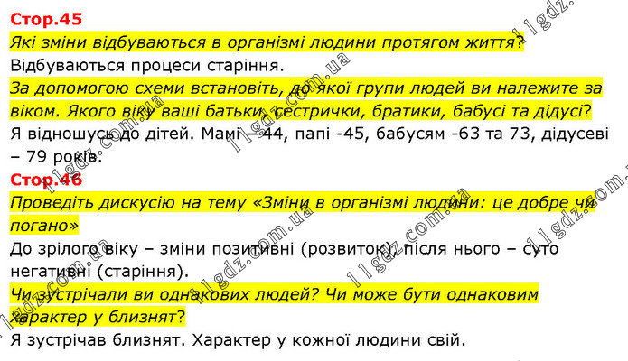 Стор.45 Які зміни відбуваються в організмі людини протягом життя? Відбуваються процеси старіння. За допомогою схеми встановіть, до якої групи людей ви належите за віком. Якого віку ваші батьки, сестрички, братики, бабусі та дідусі? Я відношусь до дітей. Мамі – 44, папі -45, бабусям -63 та 73, дідусеві – 79 років. Стор.46 Проведіть дискусію на тему «Зміни в організмі людини: це добре чи погано» До зрілого віку – зміни позитивні (розвиток), після нього – суто негативні (старіння). Чи зустрічали ви однакових людей? Чи може бути однаковим характер у близнят? Я зустрічав близнят. Характер у кожної людини свій.