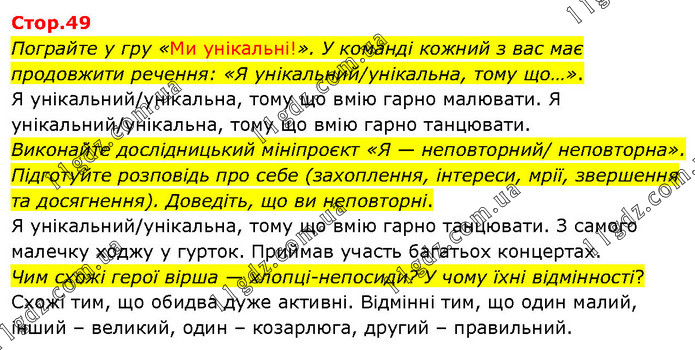 Пограйте у гру «Ми унікальні!». У команді кожний з вас має продовжити речення: «Я унікальний/унікальна, тому що…». Я унікальний/унікальна, тому що вмію гарно малювати. Я унікальний/унікальна, тому що вмію гарно танцювати. Виконайте дослідницький мініпроєкт «Я — неповторний/ неповторна». Підготуйте розповідь про себе (захоплення, інтереси, мрії, звершення та досягнення). Доведіть, що ви неповторні. Я унікальний/унікальна, тому що вмію гарно танцювати. З самого малечку ходжу у гурток. Приймав участь багатьох концертах. Чим схожі герої вірша — хлопці-непосиди? У чому їхні відмінності? Схожі тим, що обидва дуже активні. Відмінні тим, що один малий, інший – великий, один – козарлюга, другий – правильний.