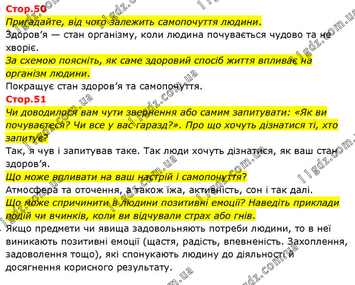 Стор.50 Пригадайте, від чого залежить самопочуття людини. Здоров’я — стан організму, коли людина почувається чудово та не хворіє. За схемою поясніть, як саме здоровий спосіб життя впливає на організм людини. Покращує стан здоров’я та самопочуття. Стор.51 Чи доводилося вам чути звернення або самим запитувати: «Як ви почуваєтеся? Чи все у вас гаразд?». Про що хочуть дізнатися ті, хто запитує? Так, я чув і запитував таке. Так люди хочуть дізнатися, як ваш стан здоров’я. Що може впливати на ваш настрій і самопочуття? Атмосфера та оточення, а також їжа, активність, сон і так далі. Що може спричинити в людини позитивні емоції? Наведіть приклади подій чи вчинків, коли ви відчували страх або гнів. Якщо предмети чи явища задовольняють потреби людини, то в неї виникають позитивні емоції (щастя, радість, впевненість. Захоплення, задоволення тощо), які спонукають людину до діяльності й досягнення корисного результату.