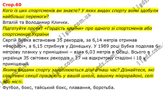 Кого із цих спортсменів ви знаєте? У яких видах спорту вони здобули найбільші перемоги? Віталій та Володимир Клички. Підготуйте проект «Гордість країни» про одного зі спортсменів або спортсменок України Сергій Бубка встановив 35 рекордів, за 6,14 метрів отримав «Феррарі», а 6,15 стрибнув у Донецьку. У 1989 році Бубка подолав 6-метрову планку у приміщенні – взяв 6,03 метрів в Осаці. Всього в українця 35 світових рекордів – 17 на відкритому стадіоні і 18 у приміщенні. Якими видами спорту захоплюються діти в наш час? Дізнайтеся, які спортивні секції працюють у вашій школі, вашому мікрорайоні, селі або місті. Футбол, бокс, тайський бокс, плавання, боротьба.